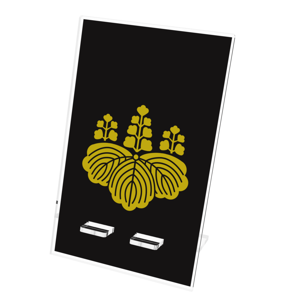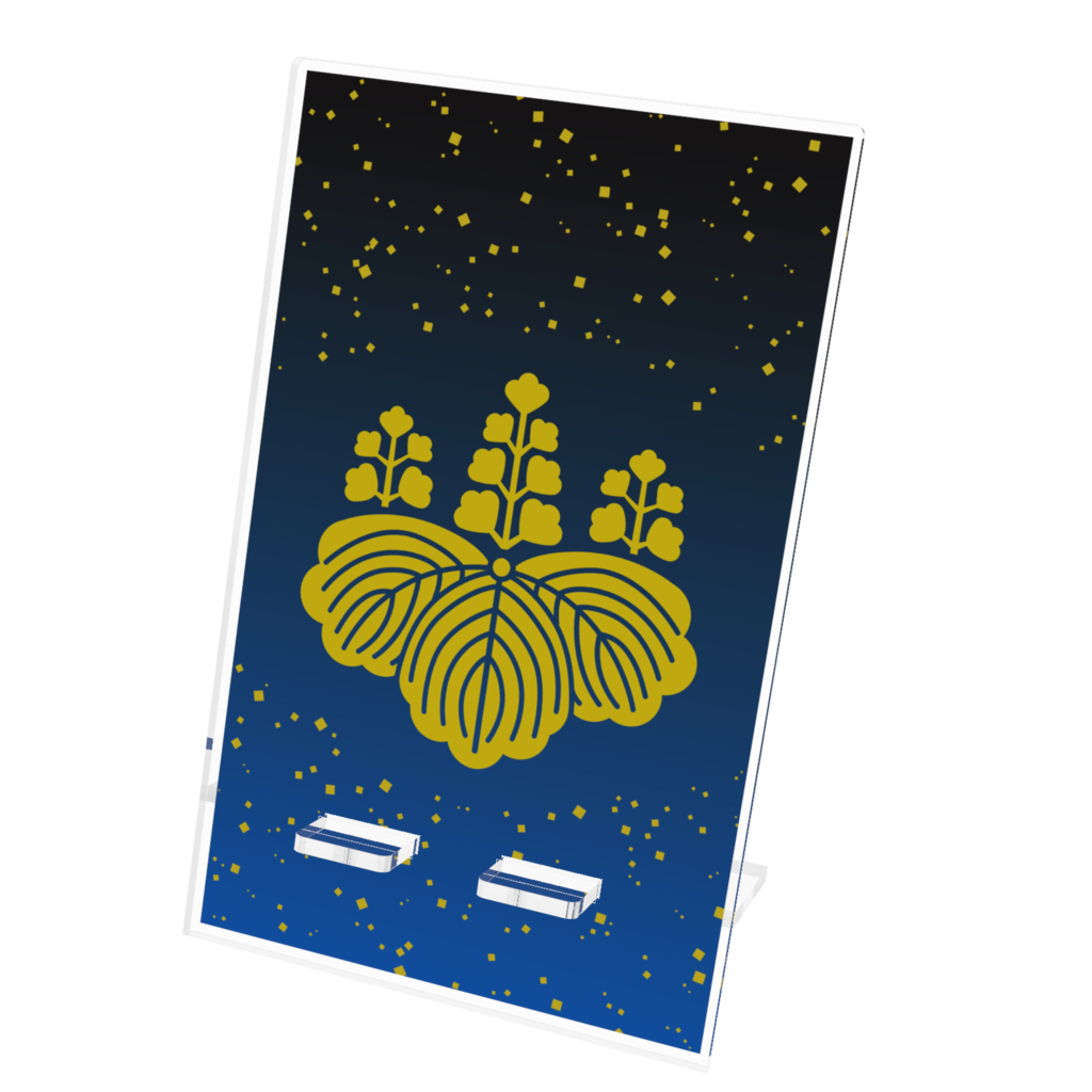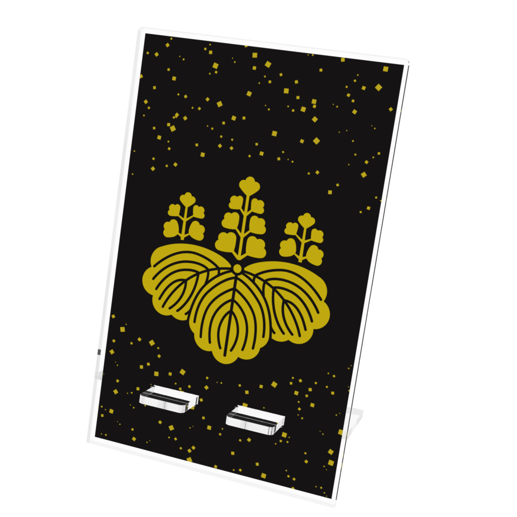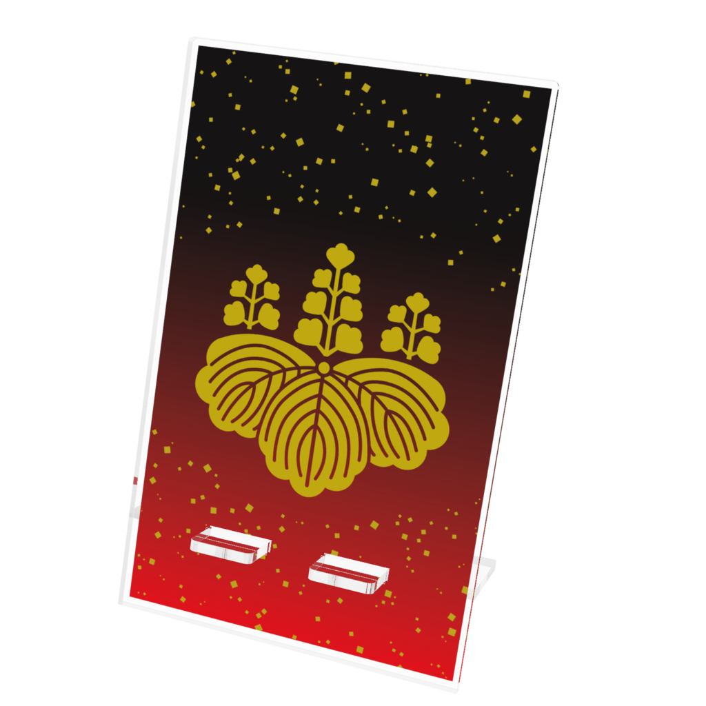 戦国武将 豊臣秀吉 豊臣秀頼親子2代の家紋「五七の桐」をあしらったアクリルスマホスタンドです。