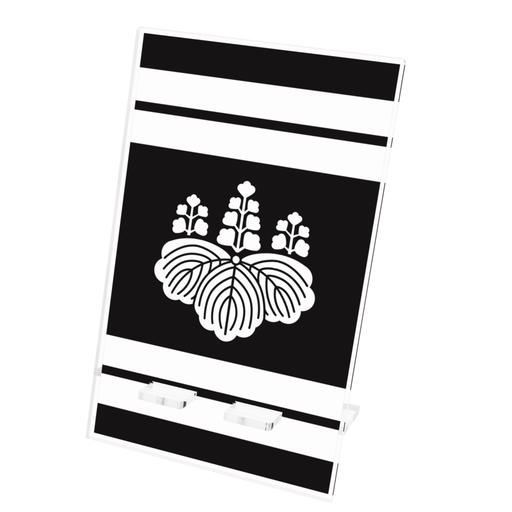 スマホスタンド豊臣秀吉 豊臣秀頼 家紋 五七の桐 黒地に白縞 指物風