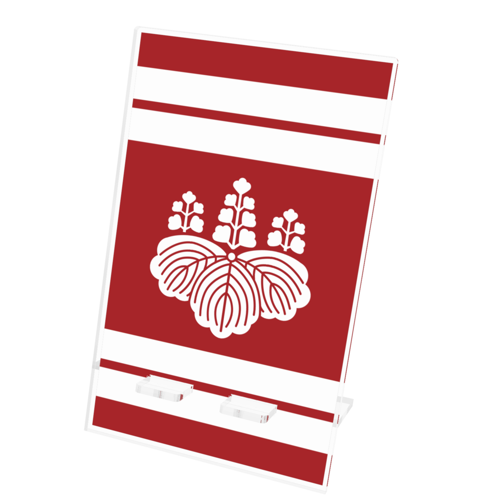 スマホスタンド豊臣秀吉 豊臣秀頼 家紋 五七の桐 赤地に白縞 指物風